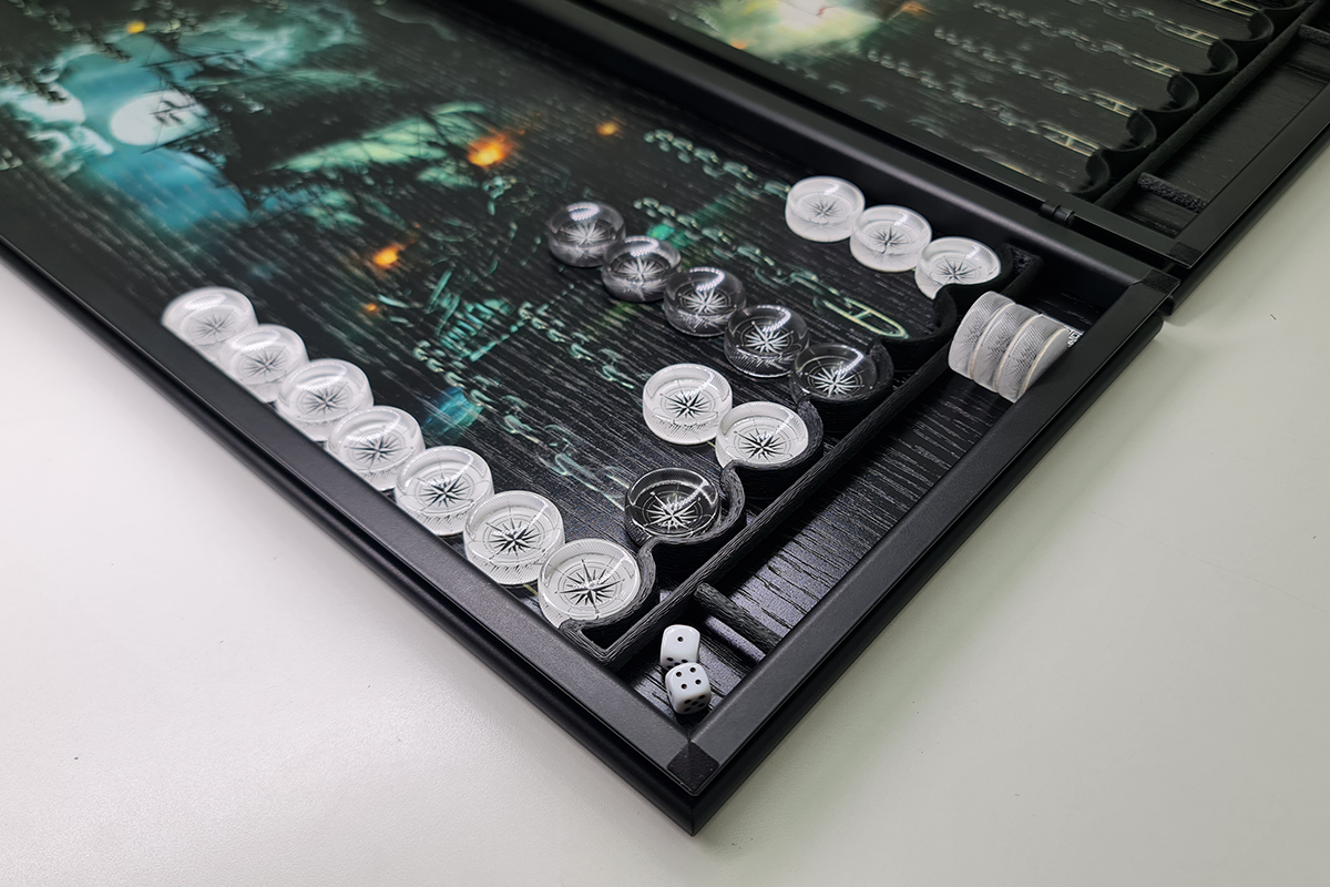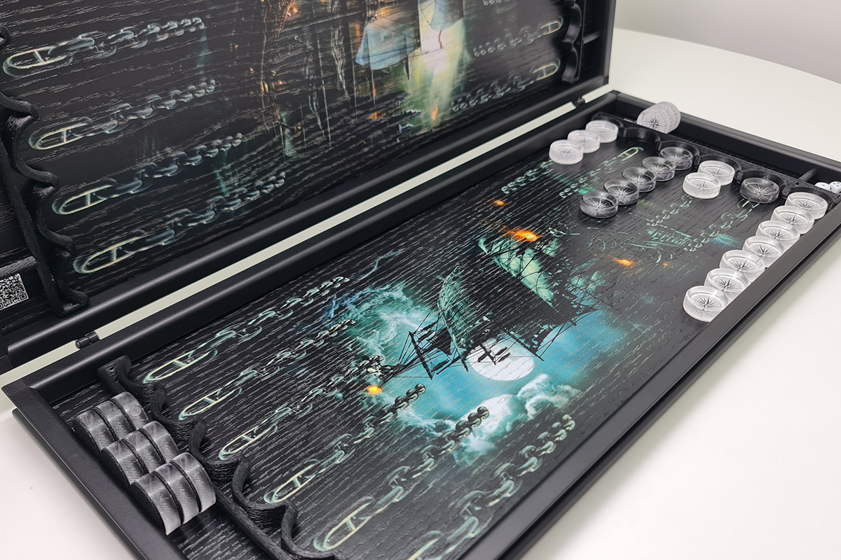 הדגם “ספינת פיראטים” מביא אווירה ימית נועזת למשחק הקלאסי. משטח מצופה אלון עם הדפסה מדויקת ב-UV מוקף באלומיניום מוצק, מספק עמידות ומראה מעודן.